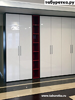 Высота: 2540 мм Шкаф изготовлен на заказ по индивидуальным размерам. Конструкция, цвет, комплектация, размеры и наполнение могут быть любыми. Материал фасадов - глянцевые панели EvoGloss (Kastamonu) белого цвета. Каркас и внутреннее наполнение шкафа изготовлено из ЛДСП Egger. Видимые части каркаса шкафа толщиной 25 мм. Вставка с полками красного цвета в середине шкафа - EvoGloss (Kastamonu). В шкафу установлено 6 высоких распашных дверей от пола до потолка. Шкаф установлен в гостиной, объединенной с кухней, и, зрительно продолжающий ряд шкафов в прихожей. Интерьер всей квартиры выполнен в современном стиле. Каждое изделие проектируется и изготавливается на заказ по индивидуальным размерам. Ориентировочная стоимость по состоянию на август 2024 года в зависимости от материалов фасадов составит: